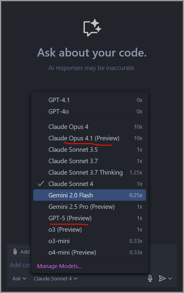 比如 GPT 5 和 Claude 4.1 Opus 这两个大模型刚发布,就可以在 Copilot 中使用了,不过要注意的是,Copilot Pro+用户才可用,39 美元/月。