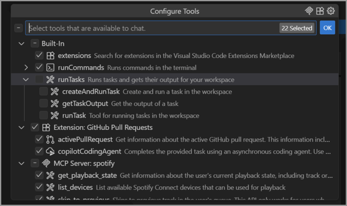 目前,单次聊天请求中可使用的工具数量上限为 128 个。此前,可通过安装包含大量工具的 MCP 服务器快速达到此限制,此时需手动取消选择部分工具才能继续操作。